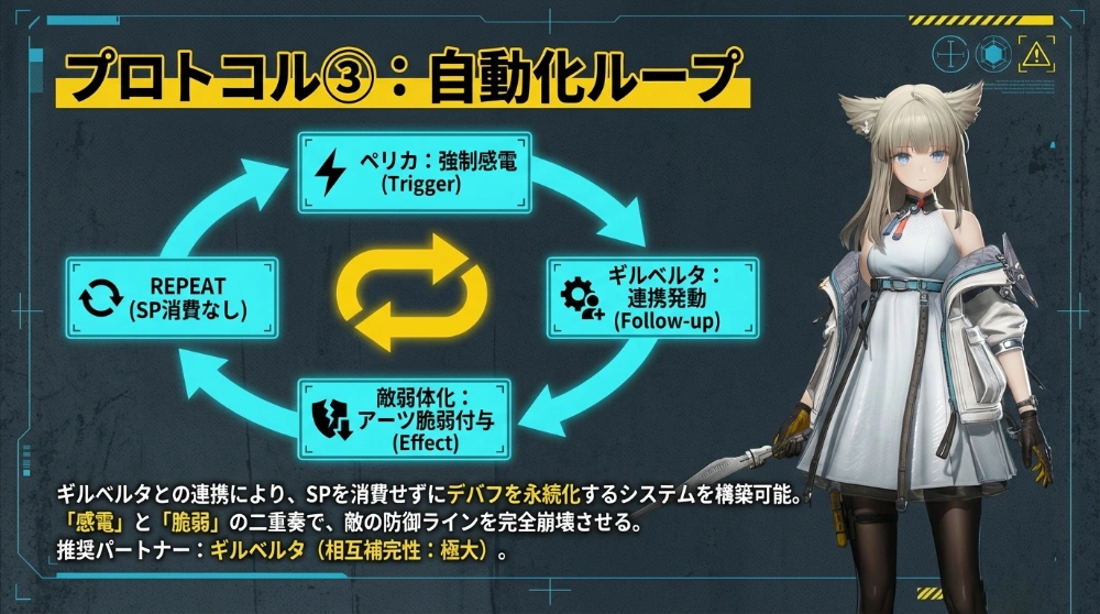 ペリカのアイデンティティであり、唯一無二の強みが、連携技「即時協約:閃光鎖」による強制感電付与です。このメカニクスには、アナリストが注目すべき2つの技術的優位点があります。