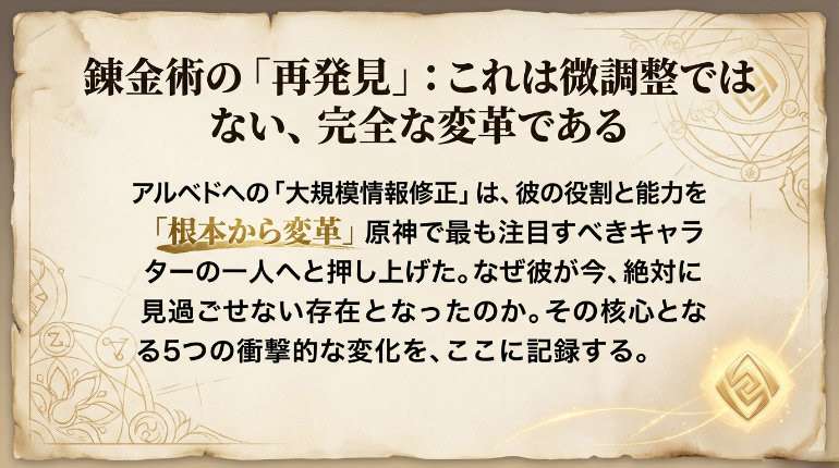 アルベドへの「情報修正」は、単なる微調整ではありませんでした。彼の役割と能力を根本から変革し、原神で最も注目すべきキャラクターの一人へと押し上げました。なぜ彼が今、絶対に見過ごせないキャラクターになったのか、5つの衝撃的な変化を解説します。