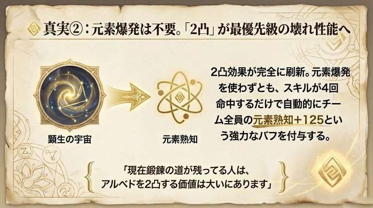 2凸効果が完全に刷新され、元素爆発の使用が不要になりました。スキルが4回命中すると自動追撃が発生し、同時にチーム全員の元素熟知+125という強力なバフが付与されます。