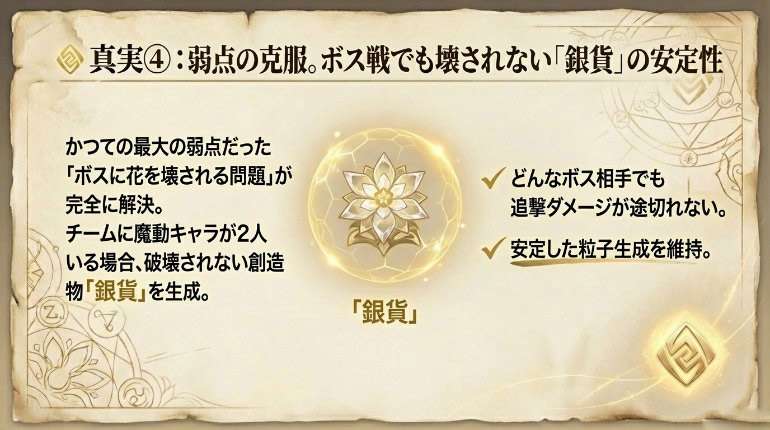かつての弱点だった「ボスに花を壊される問題」が解決。チームに魔動キャラが2人いる場合、破壊されない創造物「銀貨」を生成可能になりました。