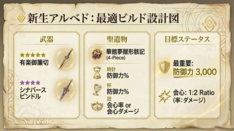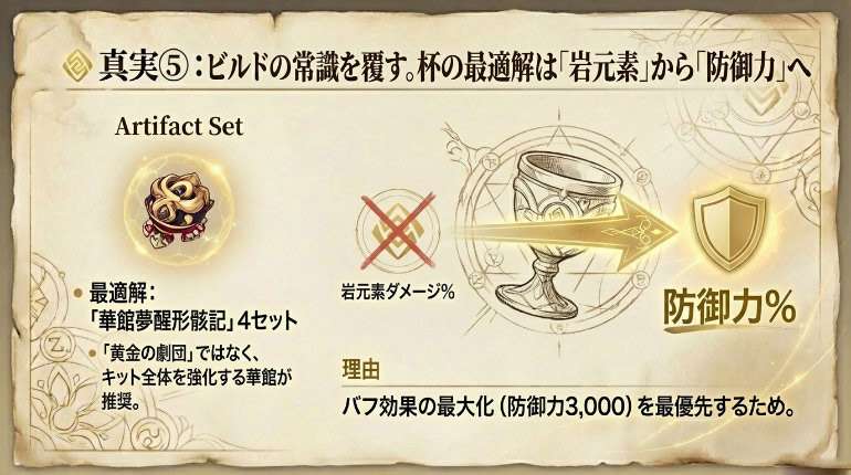 推奨聖遺物は「黄金の劇団」ではなく、キット全体を強化できる「華館夢醒形骸記」4セットが最適です。また、バフ最大化(防御3,000目標)のために、杯のメインステータスは「防御力%」が推奨されます。