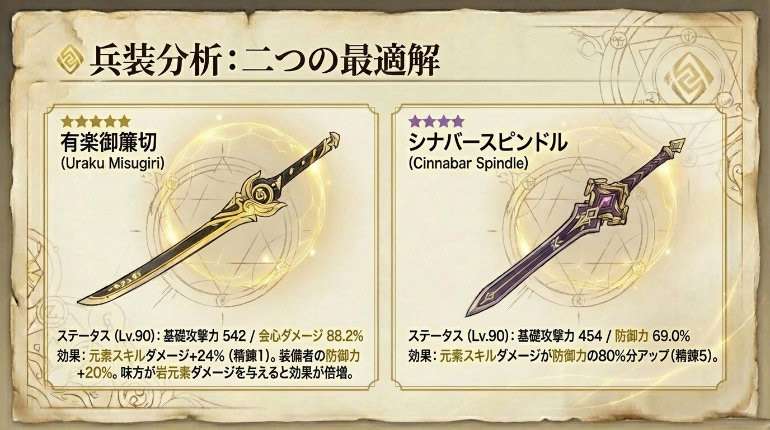 通常攻撃ダメージ+16/20/24/28/32%、元素スキルダメージ+24/30/36/42/48%。付近にいるチーム内キャラクターがフィールド上で岩元素ダメージを与えた後、上記ダメージアップ効果が元の100%分アップ、継続時間15秒。また、装備者の防御力+20/25/30/35/40%。
